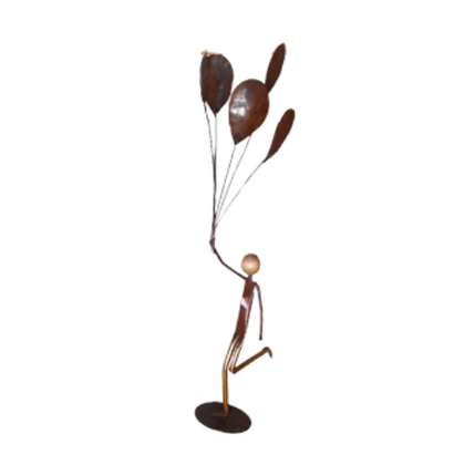 Escultura menino balões em ferro. Disponível na opção: natural.